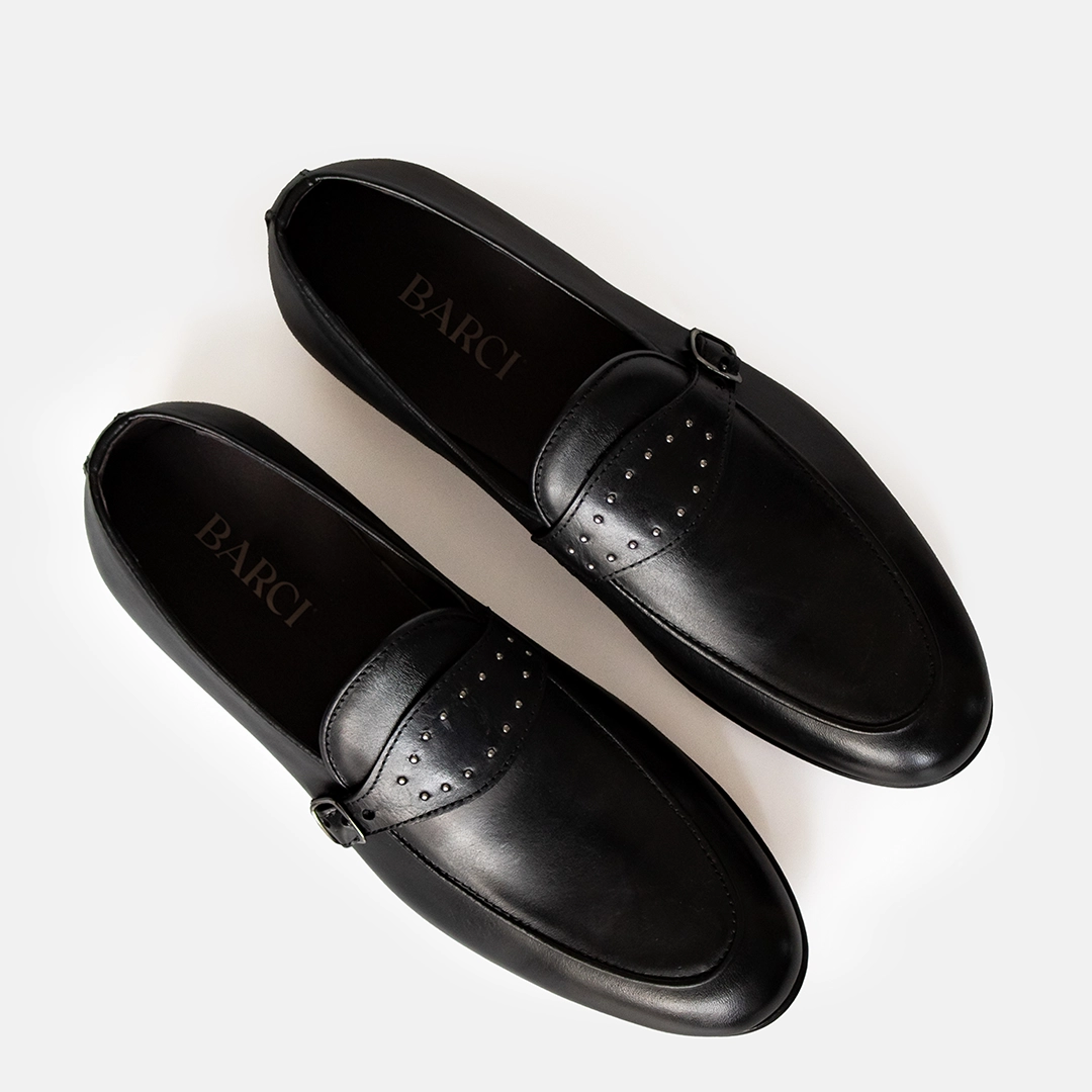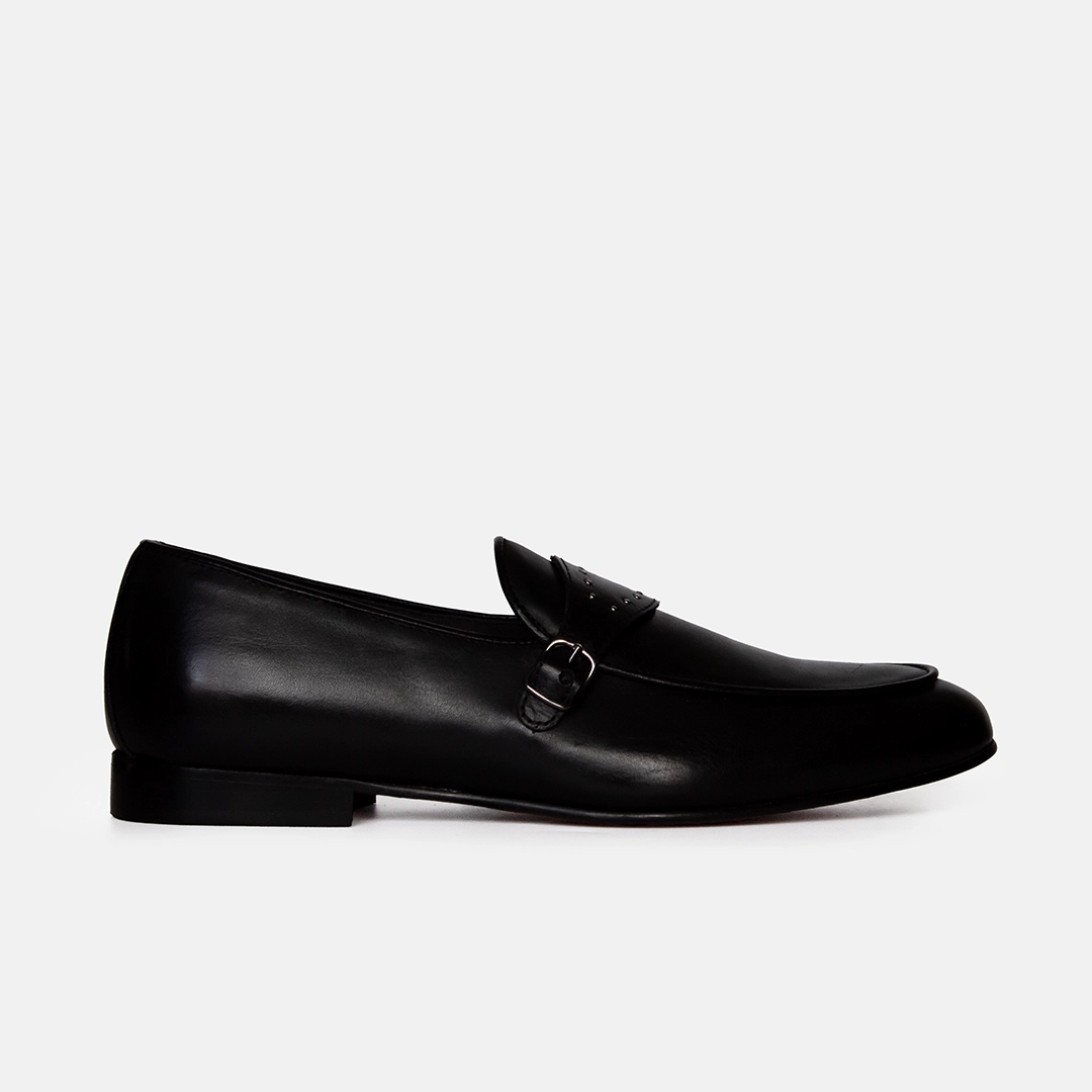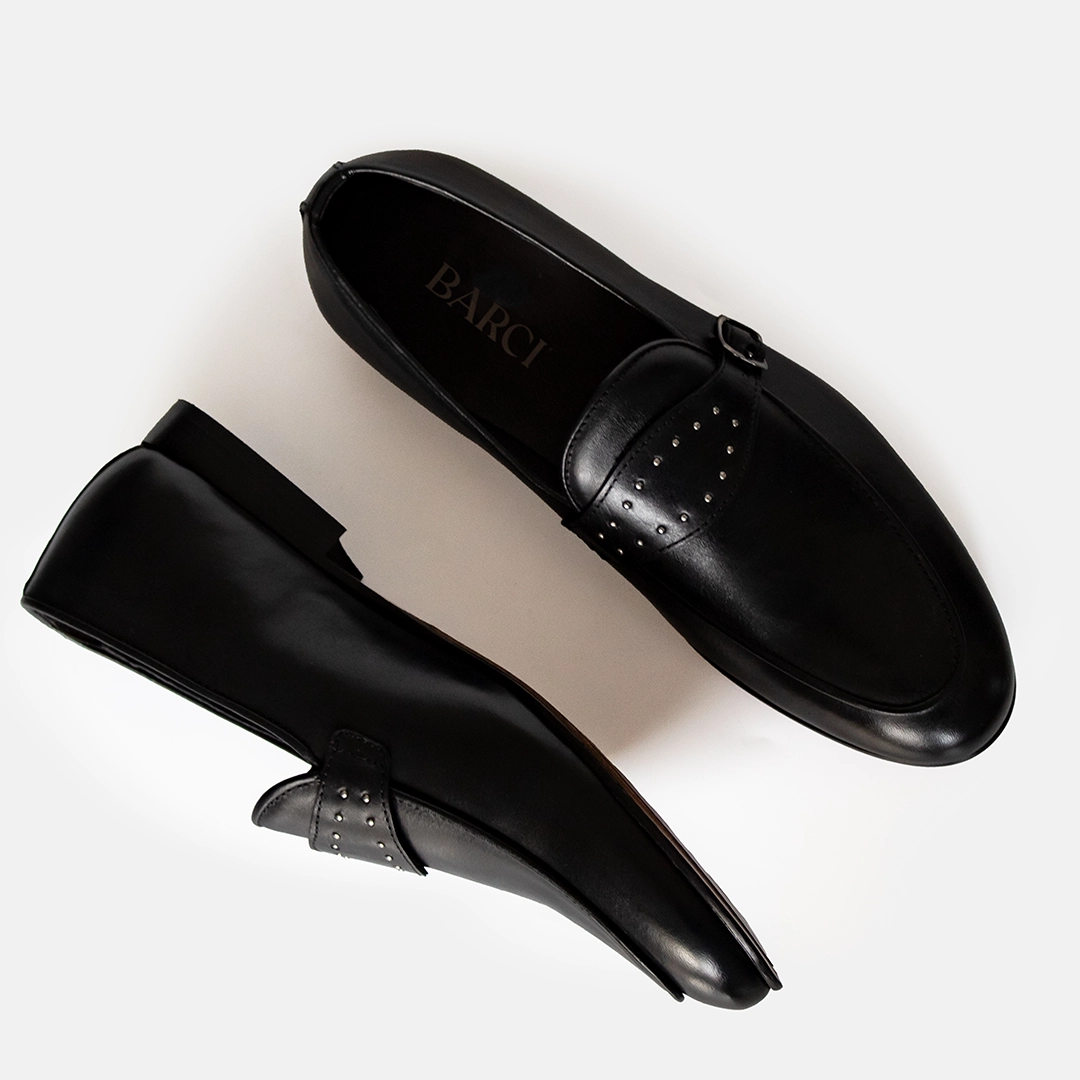 Signorelli è un mocassino elegante e minimalista, realizzato in pregiata pelle nera. Il design è arricchito da un inserto con micro-borchie che dona un tocco di carattere, mentre la fibbia laterale aggiunge raffinatezza. Una scelta ideale per chi ama distinguersi con classe.